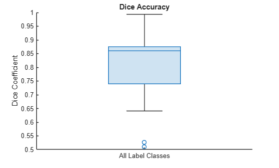 figure boxchart(diceResult) title("Dice Accuracy") xticklabels("All Label Classes") ylabel("Dice Coefficient")