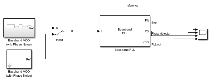 The Baseband PLL block models PLLs in the phase domain. The block accepts a real-valued phase offset vector and produces the outputs for a loop filter, phase detector, and VCO. The block acts as feedback control system that automatically adjusts the phase of a locally generated signal to match the phase of an input signal.