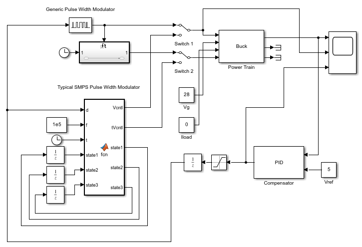 You can combine the power train Simulink block from the operating point analysis with the compensator Simulink block from the controller design and a pulse width modulator (PWM) to be discussed in this section to create a time domain simulation of the closed loop behavior of the power supply.