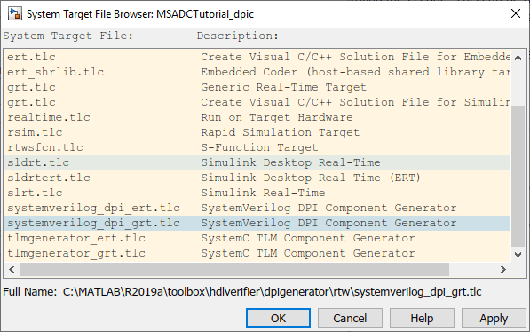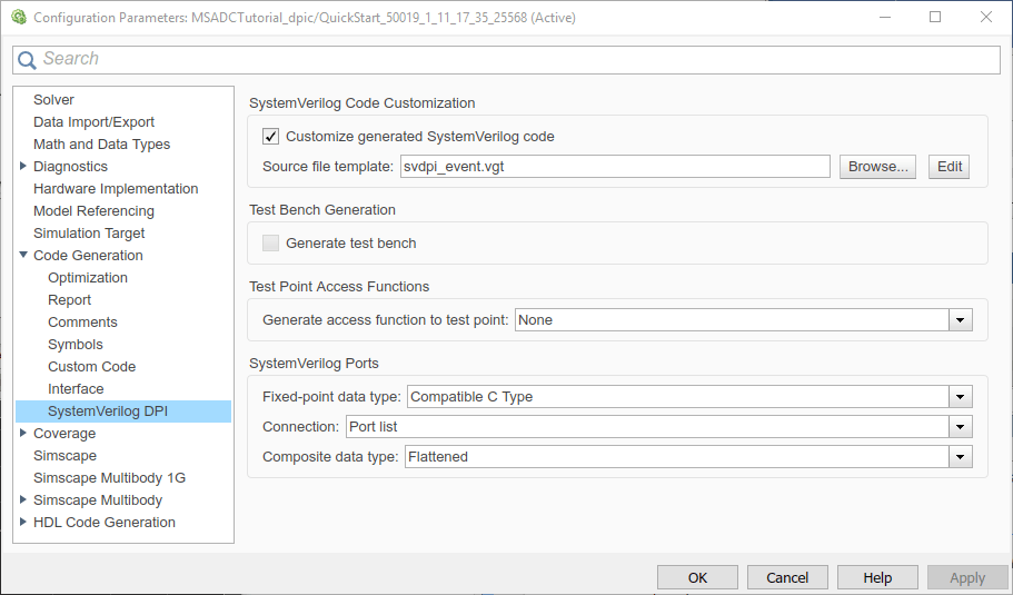 cfg = getActiveConfigSet(model); %Pick Target file for DPI-C gen switchTarget(cfg,'systemverilog_dpi_grt.tlc',[]); cfg.set_param('DPICustomizeSystemVerilogCode', 'on'); % Customize generated SystemVerilog code cfg.set_param('GenerateReport', 'off'); % Dont Create code generation report