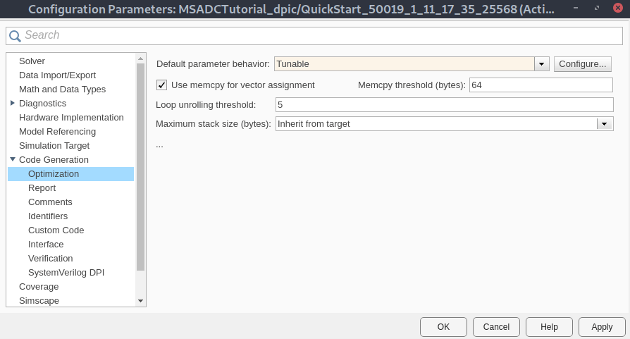 Click on "Configure" from the Optimization tab under Code Generaration to configure the tunable parameters. The Sine Source block specifies two tunable parameters: A,