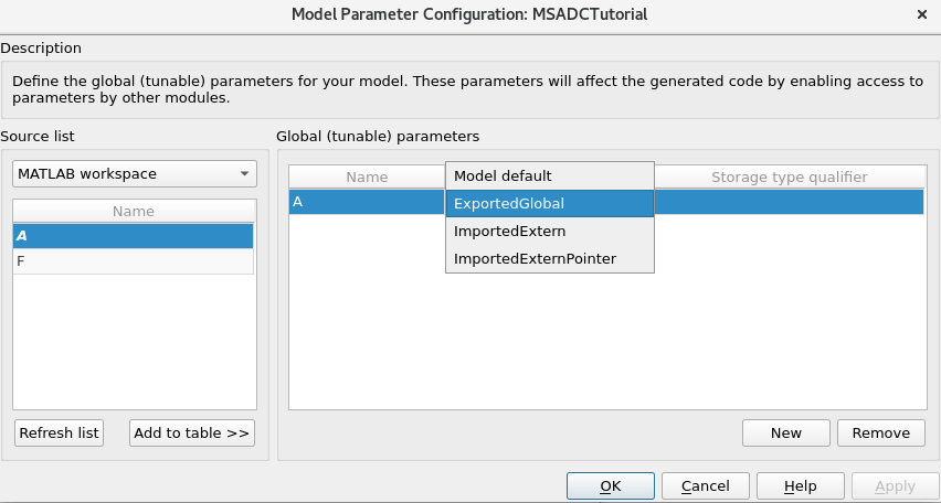 representing its frequency. You define the two parameters to use "ExportedGlobal" storage class. This makes sure that A and F will be tunable parameters also in the generated SystemVerilog module.