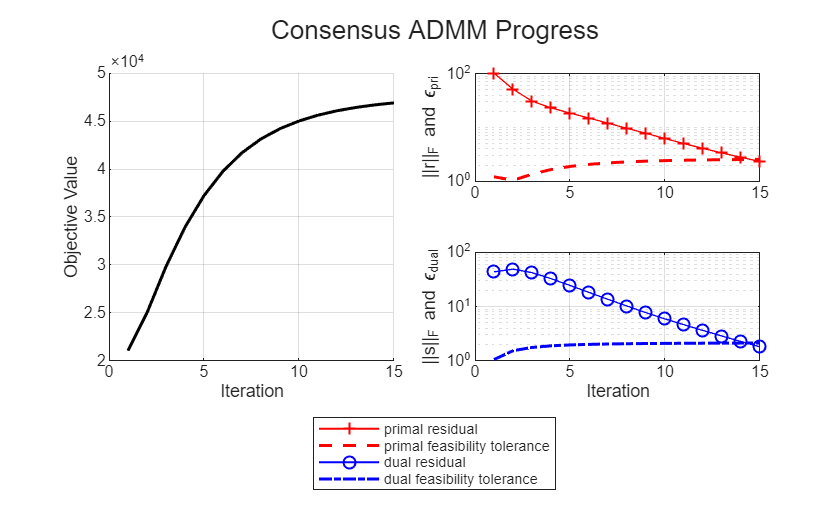 To reduce data transfer overheads, distributed arrays A, b, u, and x remain on the workers between iterations. Only the consensus vector z is reduced and then redistributed between iterations. The updateX, saveHistory, and plotHistory helper functions are attached to this example as supporting files.