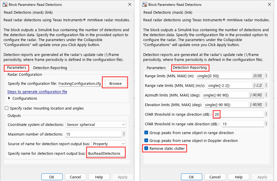 In the Read Detections block in this example, the name of the detection report output bus is specified as BusReadDetections. Compared to the default values, the block also uses a different value for the CFAR threshold in range direction and it also removes static clutter during detections. You can verify this setting in the Detection Reporting tab.