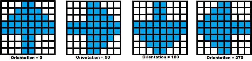 You can rotate the image displayed on the LED matrix by specifying the Orientation. The image can be oriented at 0, 90, 180, or 270 degrees. You can orientate the image. For any other value you give to the image orientation, the block defaults the image orientation to 0 degree.
