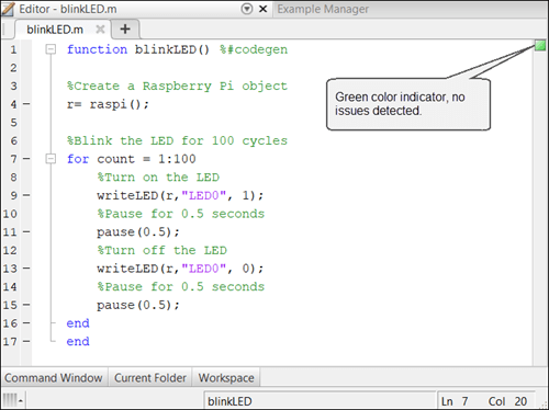 1. Copy the blinkLED function and paste it in the MATLAB Editor. The function implements an algorithm to blink the ACT LED on the Raspberry Pi hardware every 0.5 seconds for 100 cycles.