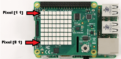 The rows and columns are numbered 1 to 8. Pixel at location [1 1] is at the top left corner of the LED Matrix. The location is with respect to the reference position of the Sense HAT. The HDMI port of the Raspberry Pi board facing downwards is the reference position.