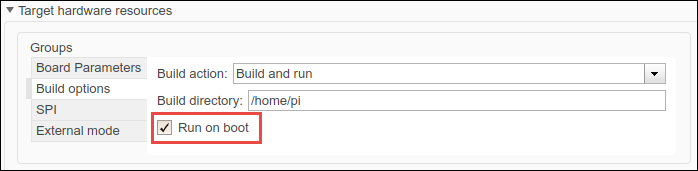 Raspberry Pi. This selection automatically populates the parameters in the Hardware board settings with the default values for the Raspberry Pi hardware.From the Groups list under Target hardware resources, select Build options > Run on boot.