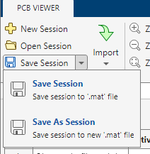 Once you have imported all the PCB databases you need, you can save the session as a '.mat' file. Click on Save Session. Saving a session saves time when restarting the App, since all the imported boards will be automatically reloaded when a session is opened.