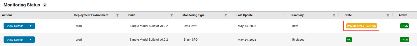 Modelscape supports automated actions to, for example, send an email alert to model owners in informing them of the change in state. To find further information about the data drift monitoring, click View Details. This takes you to the Monitoring Evaluations page.