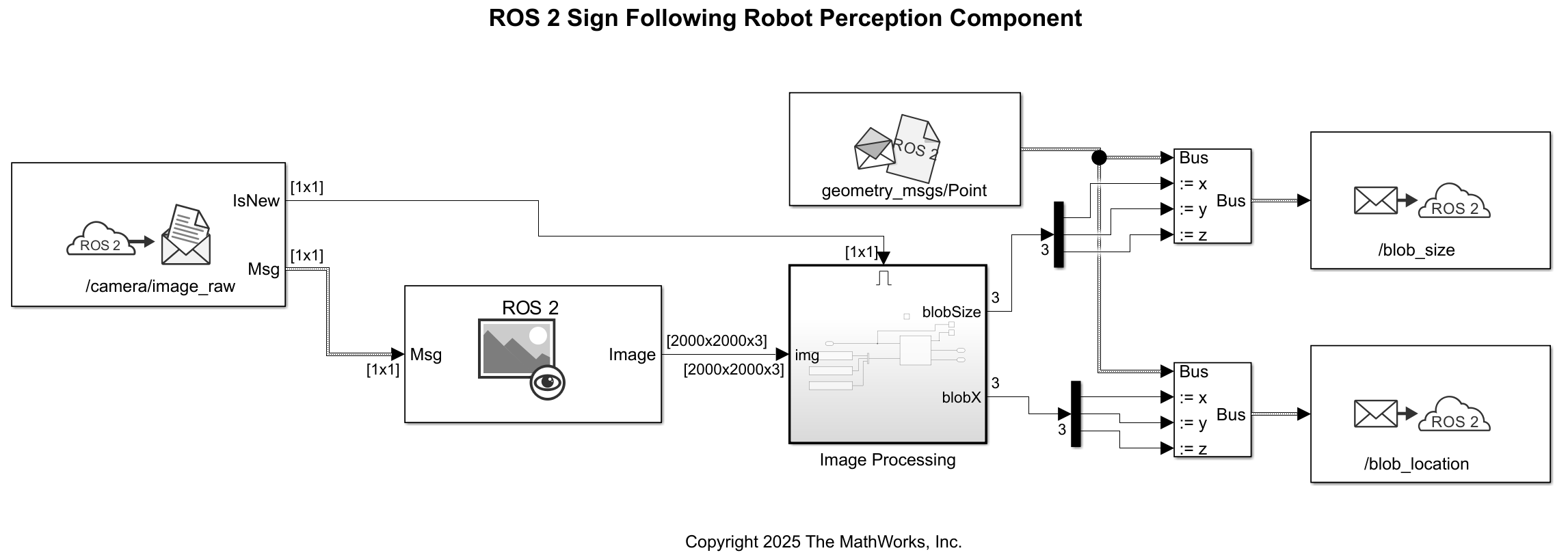 This example shows how to generate ROS 2 component nodes from Simulink for handling perception and tracking logic of a sign-following robot. It also shows how to load and run the generated ROS 2 components in a docker container running the simulated robot in Gazebo.
