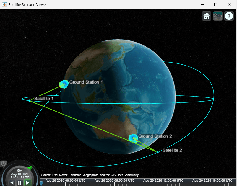 startTime = datetime(2020,8,19,20,55,0); % 19 August 2020 8:55 PM UTC stopTime = startTime + days(1); % 20 August 2020 8:55 PM UTC sampleTime = 60; % seconds sc = satelliteScenario(startTime,stopTime,sampleTime);