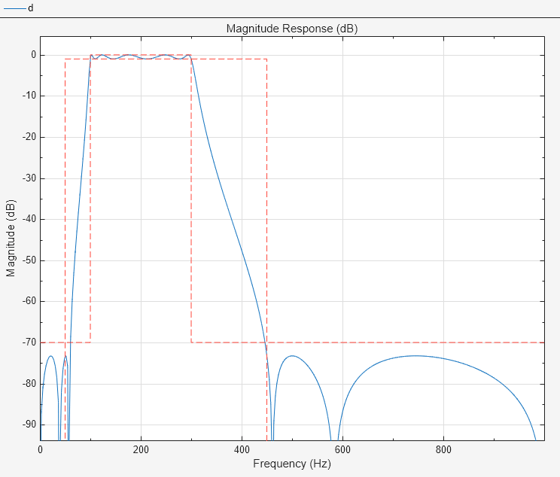 Generate MATLAB function>Digital Filter Object. The code appears in the editor.function designedFilter = bandpassiir1filt designedFilter = designfilt('bandpassiir', ... 'StopbandFrequency1',50,'PassbandFrequency1',100, ... 'PassbandFrequency2',300,'StopbandFrequency2',450, ... 'StopbandAttenuation1',70,'PassbandRipple',1, ... 'StopbandAttenuation2',70,'SampleRate',2000, ... 'DesignMethod','ellip','MatchExactly','passband'); end