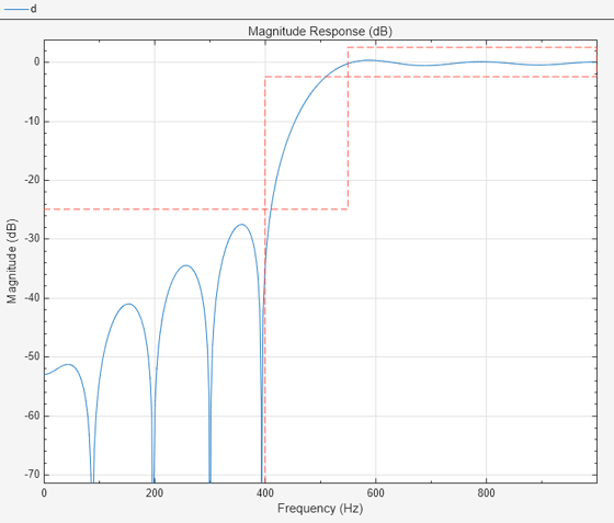 Generate MATLAB function>Digital Filter Object. The code appears in the editor.function designedFilter = highpassfir1filt designedFilter = designfilt('highpassfir', ... 'StopbandFrequency',400,'PassbandFrequency',550, ... 'StopbandAttenuation',25,'PassbandRipple',5, ... 'SampleRate',2000,'DesignMethod','kaiserwin', ... 'MinOrder','Even','ScalePassband',false); end