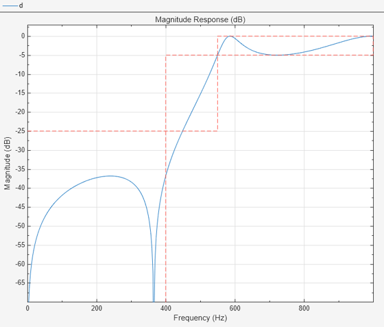 Generate MATLAB function>Digital Filter Object. The code appears in the editor.function designedFilter = highpassiir1filt designedFilter = designfilt('highpassiir', ... 'StopbandFrequency',400,'PassbandFrequency',550, ... 'StopbandAttenuation',25,'PassbandRipple',5, ... 'SampleRate',2000,'DesignMethod','ellip', ... 'MatchExactly','passband','ScaleSOS',true); end
