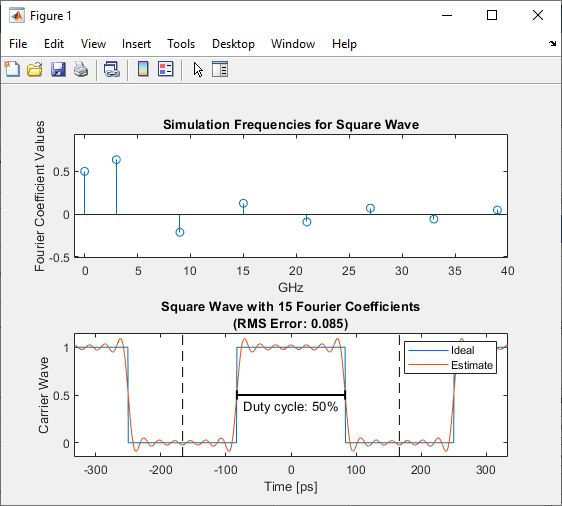 Changing the Number of Fourier coefficients, DC Bias, and Duty Cycle parameters to different values to view the effect on the visualization plot and output.