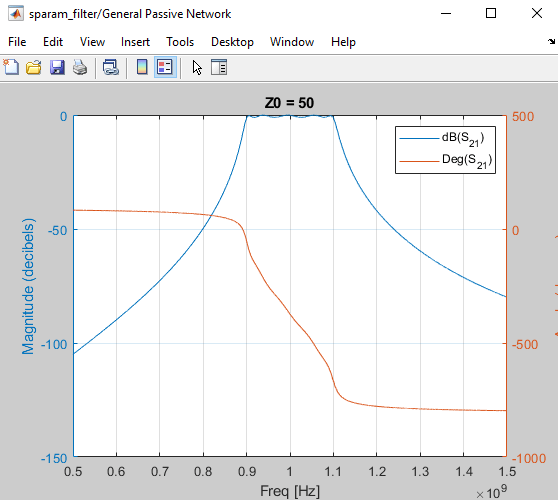In this example, you model the frequency response of a passive component using data from a Touchstone file, defaultbandpass.s2p.