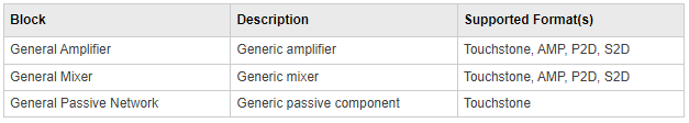 • Agilent S2D file format — Specifies amplifier and mixer network parameters with gain compression, power-dependent S21 parameters, noise data, and intermodulation tables for several operating conditions. The S2D file format lets you import system-level verification models of amplifiers and mixers.