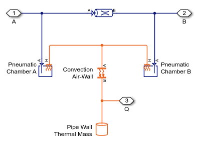 This example shows how to model a controlled actuator using simplified custom pneumatic components. There are two across variables, defined as pressure and temperature, and two through variables, defined as mass flow rate and heat flow rate. The simplified approach means that every node in the circuit must have a volume of gas associated with it. This physical volume of gas in the circuit is represented by the Constant Volume Pneumatic Chamber blocks, the Pneumatic Piston Chamber blocks, and the Pneumatic Atmospheric Reference block. Conversely, the Foundation Library gas components require no such connection rules at every node. See the Pneumatic Actuation Circuit example for a more capable way of modeling pneumatic systems using Foundation Library gas components.