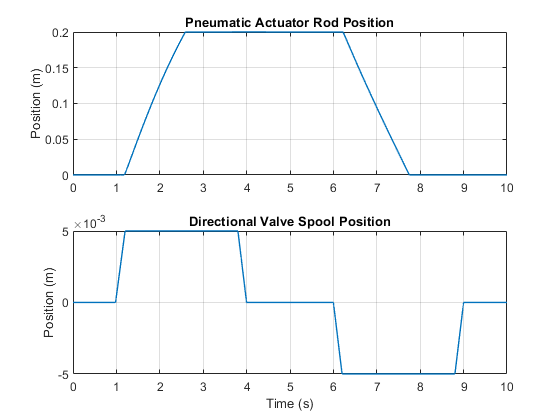 During the simulation, the spool of the directional valve is moved to its maximum positive displacement, and the actuator moves the load until it reaches the actuator end stop. The valve is then centered, and the load is held. Next the valve moves to its maximum negative displacement and the actuator retracts to its minimum length. The valve is then centered again, locking the load in position.