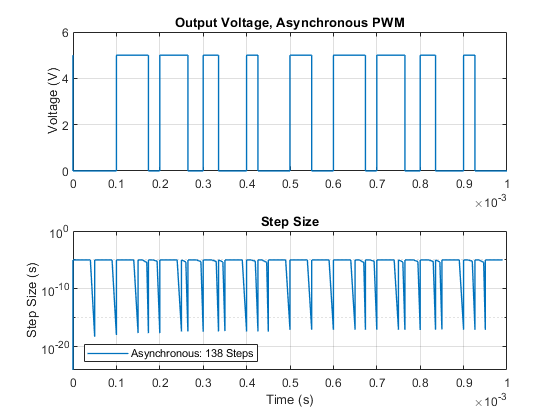 These plots show the output voltage of the Asynchronous PWM Voltage Source as well as the step size used during simulation. Because a variable-step solver is used, large steps can be taken until the start or end of a PWM pulse is reached.