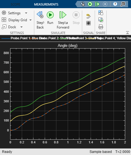 Step 3: Open the scope and simulate the model to view the angles versus time.