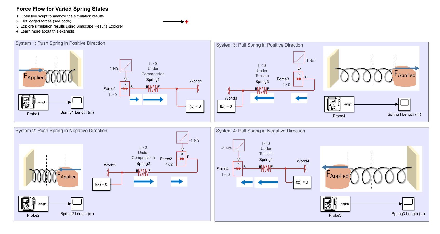 This model shows the Simscape schematic and physical view for springs in four different states. The two springs on the left are both in states of compression but have the force applied at different ends. Matching the force convention, the force flows from B to F in both springs that are in states of compression. The logged force, f, is positive for both springs. In the top left system, force flows out of a force source applied at the spring B node. Force flowing out of the source corresponds to driving the node in the positive direction. The logged force, f, is positive for the Force Source of the top left system. In the bottom left system, force flows into the force source applied at the spring F node. Force flowing into the source corresponds to driving the node in the negative direction. The logged force, f, is negative for the Force Source of the bottom left system.