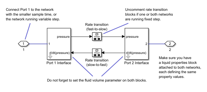 The Volume (m^3) parameter must be the same for the Port 1 Interface and Port 2 Interface blocks. In this example the value must be large enough to ensure there is always liquid in the chamber for a given time step.