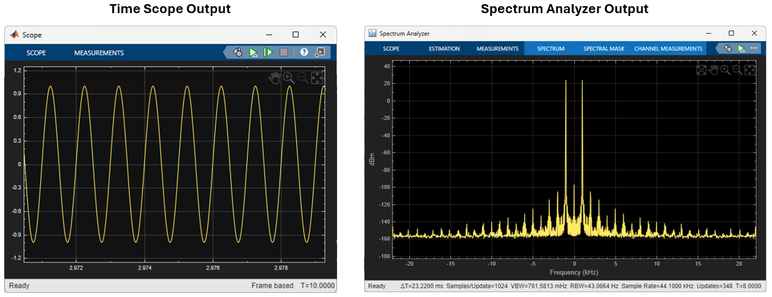 5. Move the Slider to change the frequency of the Sine Wave and observe the Spectrum Analyzer and the Time Scope blocks. The frequency you set on the slider is the tallest peak on the spectrum analyzer, while the rest of the peaks are the harmonics of this frequency. You can also change the frequency using the slider and observe the shift in the tallest peak on the spectrum analyzer. On the time scope, you can use the cursors to measure the time delay between two peaks of the audio signal. The inverse of this delay is the frequency of the audio signal.