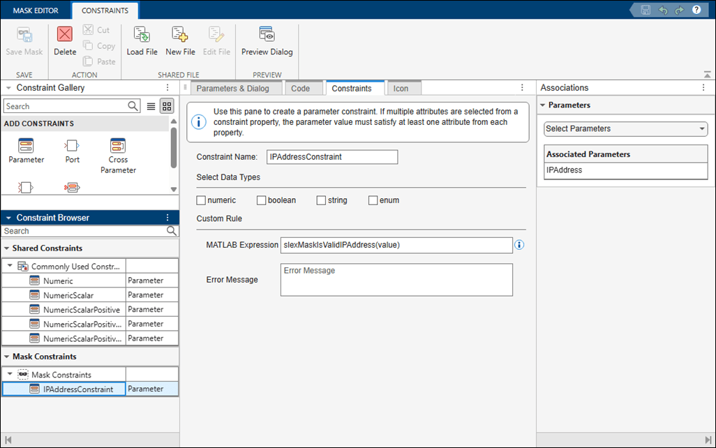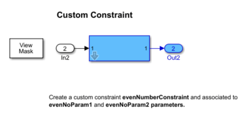 Constraints help you to create validations on a mask parameter without having to write your own validation code. Constraints ensure that input value for the mask parameter satisfies the rules associated with the constraints. For example, on a masked Subsystem block, you can set a constraint where the input value must be an even number. If you provide an input that is not an even number, the software displays an error.