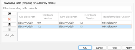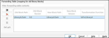 5. Create a mapping of the old block with its updated version in the Forwarding Table. Specify the block paths LibraryA/Gain and LibraryB/Gain of the library block in the Old Block Path and New Block Path columns, respectively, and click OK. To autofill the path, select the moved block in LibraryB, then select the New Block Path column in the newly added row, and click Get gcb.