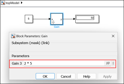 When you open the model topModel that contains links to this library block, the block parameter is updated using the Forwarding Table.
