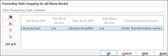 5. Create a mapping of the old block with its renamed version in the forwarding table. Specify the block paths LibraryA/Gain and LibraryA/Amplifier of the library block in the Old Block Path and New Block Path columns, respectively, and click OK. To autofill the path, select the renamed block in the library, then select the New Block Path column in the newly added row and click Get gcb.