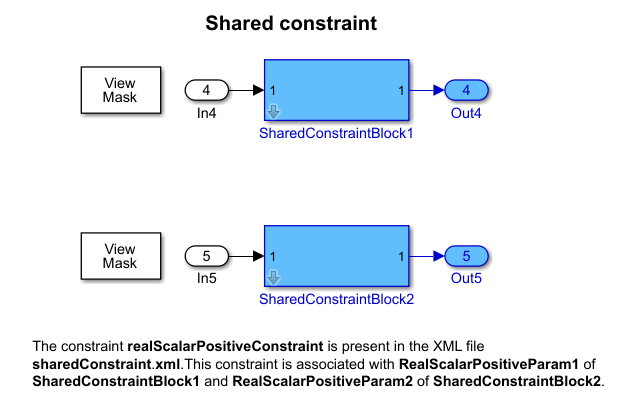 In the model slexMaskConstraints.slx, refer to the Subsystem blocks SharedConstraintBlock1 and SharedConstraintBlock2. The parameter value on both Subsystem blocks must be a real scalar.