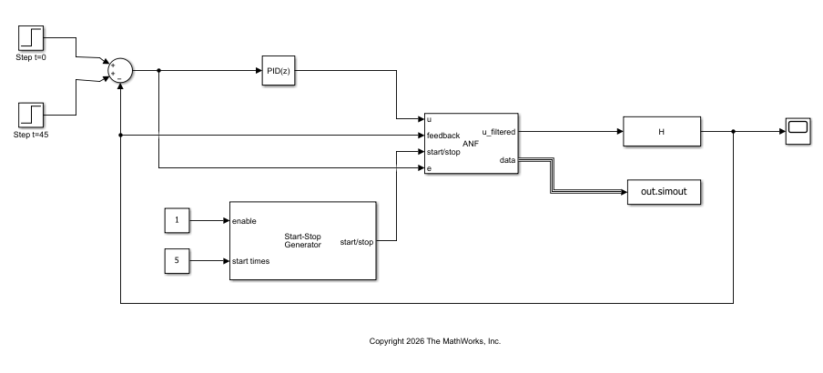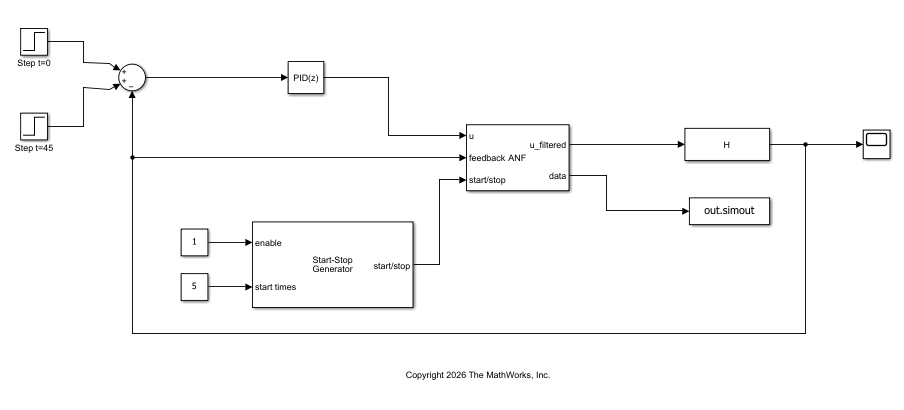 [C,info] = pidtune(H,"PID",30);The model is configured to simulate a step response at 0 s to bring the closed loop-system to a nominal operating. Between 5 and 40 seconds, the ANF block performs frequency response estimation of the plant by injecting perturbation signals. After the FRE converges and block identifies the resonance location, it starts the adaptation algorithm. The second step occurs at 45 seconds, which is the filtered output. In this configuration, the input u of the ANF block is connected to the input to the plant (controller output), feedback to the plant output , and start/stop signal enables and disables the FRE experiment. Open the model.