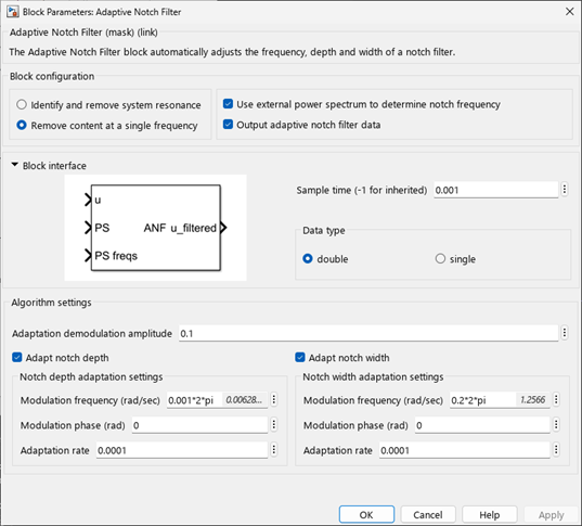 The block in this model adapts both the notch depth and width based on the identified resonance. The following image shows how the block is configured.