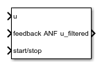 The model is configured to simulate a step response of the filtered and unfiltered plant output. The initial value of the Step block is set to 1 and the step occurs at 15 seconds. In this configuration, the input u of the ANF block is connected to the signal you want to filter, and PS and PS freqs are connected to the power spectrum and corresponding frequencies (in rad/s), obtained using the Spectrum Estimator block. Open the model.