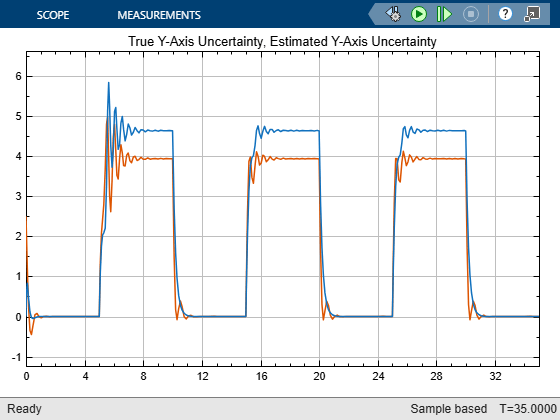 The controller estimates an accurate y-axis uncertainty model. The uncertainty model for the x-axis has the correct sign, though the magnitude is lower than that of the true uncertainty. Both uncertainty models show significant transients in the uncertainty estimate, especially during the first step change in the reference signals.