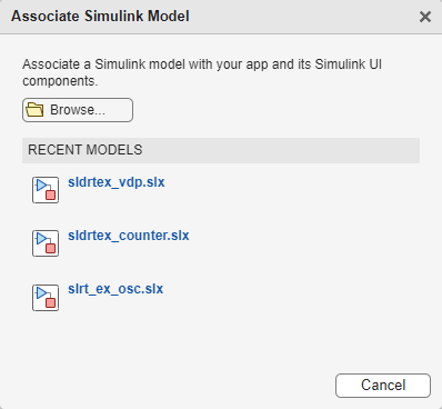To create an app that runs a Simulink model, in App Designer, select New then select Blank App for Simulink Model from the Simulink Apps group. App Designer opens the Associate Simulink Model dialog box. Select the model to associate it with the app.