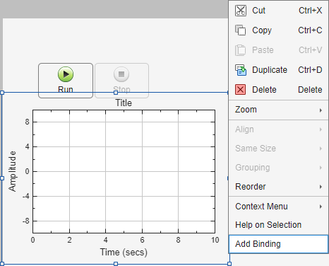 To view model signals in the app, add a component that displays signal data such as the Time Scope component from the Simulink group to the app. Right-click on the component in the app and select Add Binding to bind signals to the component. The signals in the model that are marked for logging are available for binding.