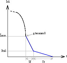 Because the current extinction process of a GTO thyristor contributes significantly to the turnoff losses, the turnoff characteristic is built into the model. The current decrease is approximated by two segments. When the gate signal becomes 0, the current Iak first decreases from the value Imax (value of Iak when the GTO thyristor starts to open) to Imax/10, during the fall time (Tf), and then from Imax/10 to 0 during the tail time (Tt). The GTO thyristor turns off when the current Iak becomes 0. The latching and holding currents are not considered.