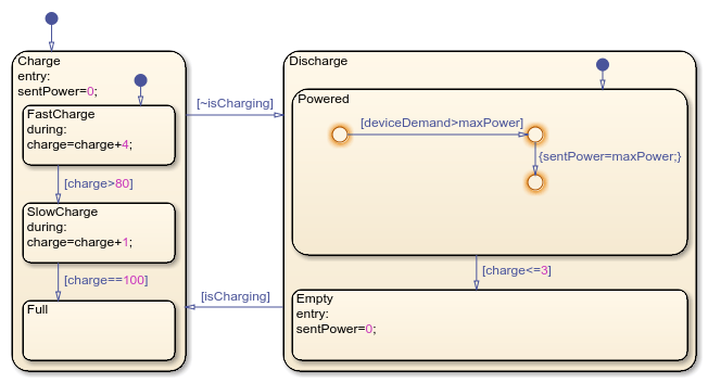 In this example, you add a flowchart to a model of a rechargeable battery system. The flowchart matches the output of the battery system to the demand of the connected device, without exceeding the limits of the battery.