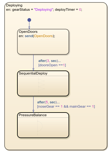 The Deploying state uses temporal logic to control when the tasks for landing gear deployment occur. The chart switches between three exclusive substates, OpenDoors, SequentialDeploy, and PressureBalance. OpenDoors is the default substate, and it becomes active first. Each subsequent substate waits for a specific time before starting, to allow for each task to complete.