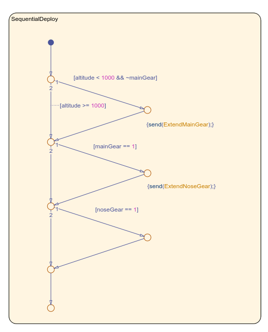 [altitude < 15000 && ~noseGear]istrue, then the chart executes the{send(ExtendNoseGear);}action.If the transition guard
