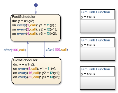 Each controller can also be modeled with a Simulink function in a Stateflow chart. This model uses function calls to schedule execution of the subsystems.