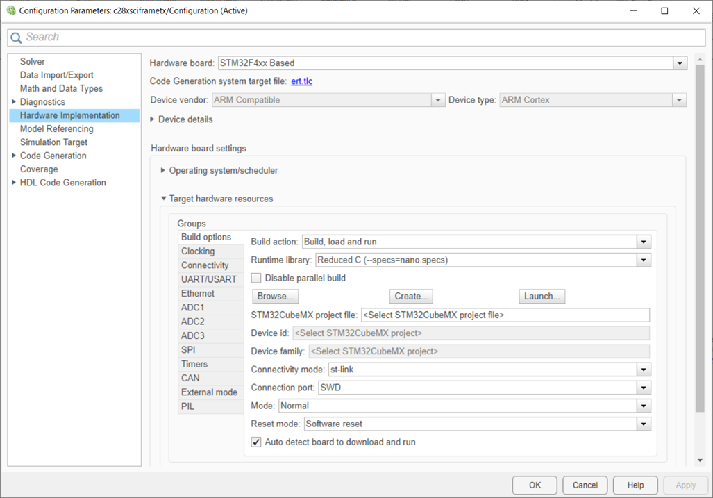 Model Configuration Parameters for STM32 Processor Based Boards