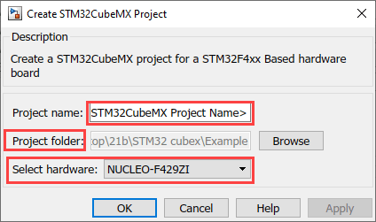 You can choose an existing STM32CubeMX project or create a new one. You can launch the project from your Simulink model. Follow the following instructions to create a model to support your STM32 processor based board: