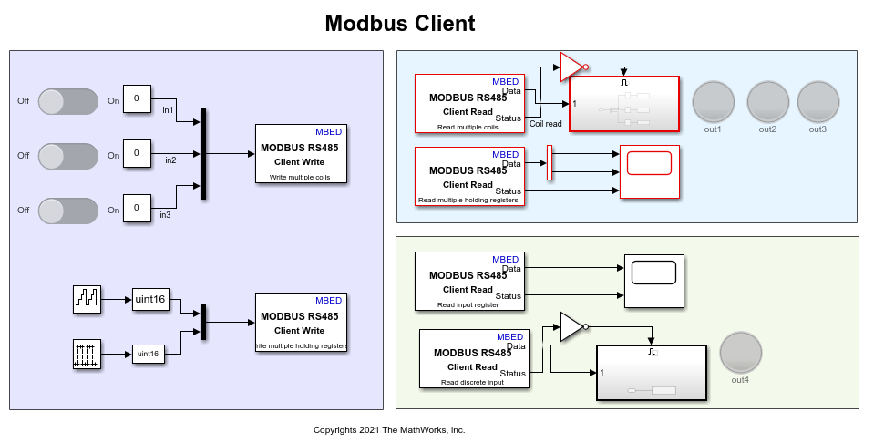 This example shows how to use the STM32™ Microcontroller Blockset to implement a MODBUS® RS485 asynchronous, serial communication between MODBUS client and server devices. It also shows the four modes of operation: Client Read, Client Write, Server Read, and Server Write.
