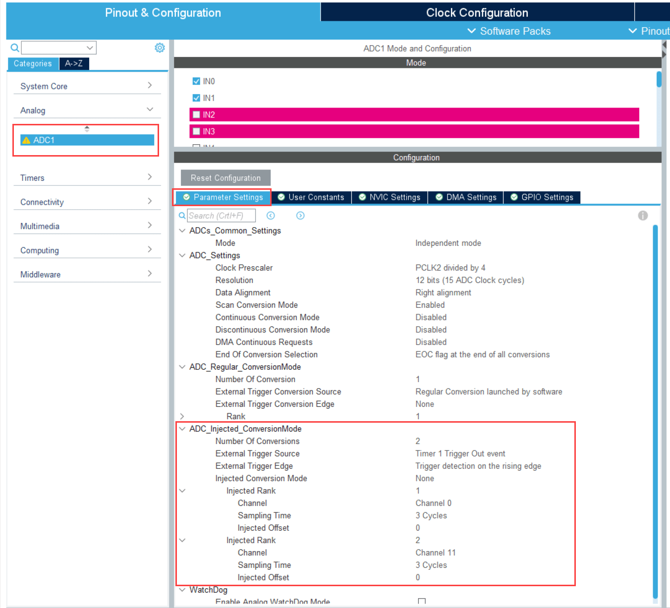 • The ADC and PWM synchronization occurs such that ADC injected group conversions start based on Timer 1 update events.