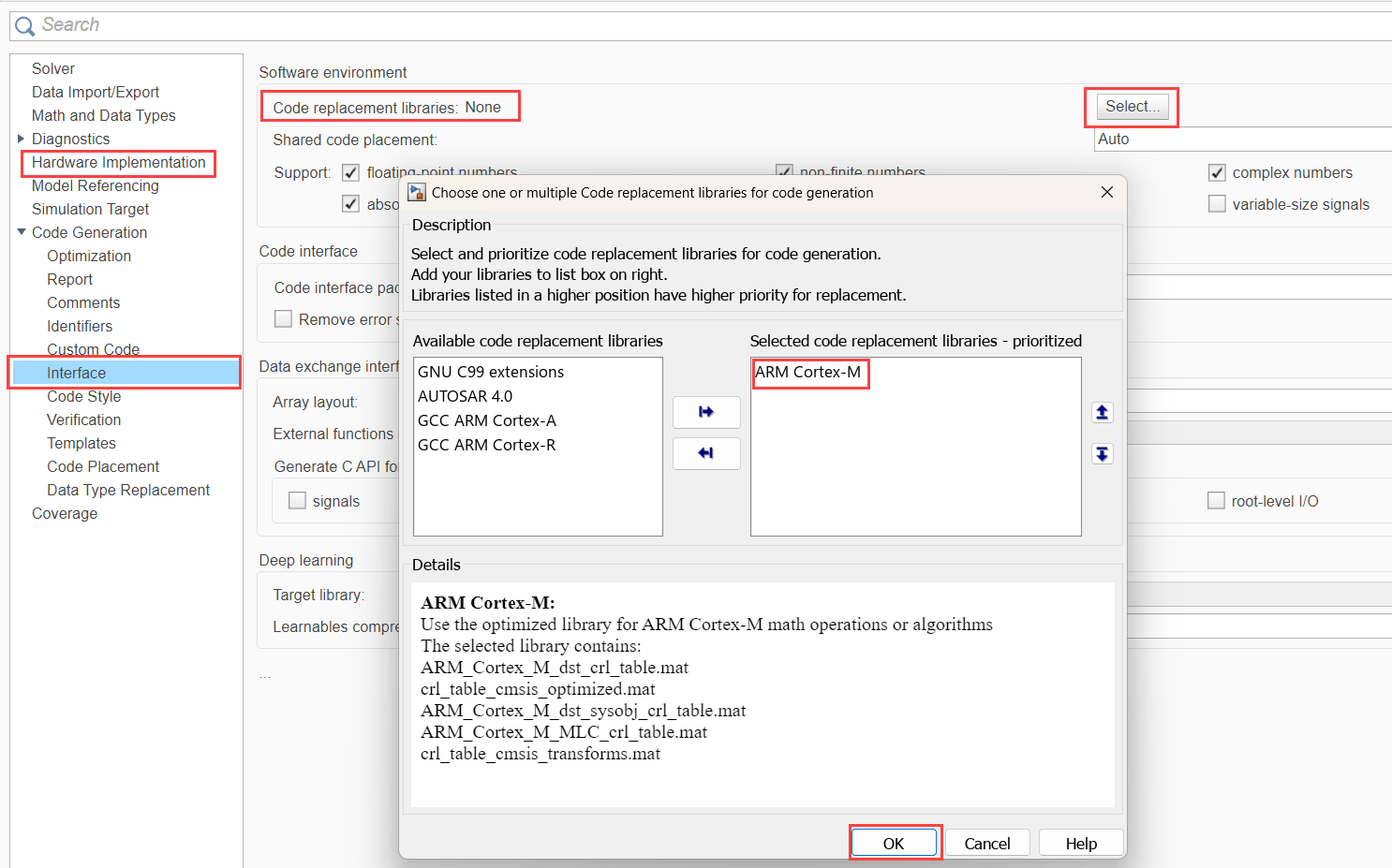 3. Go to Code Generation > Interface > Code replacement library and select Arm Cortex-M.